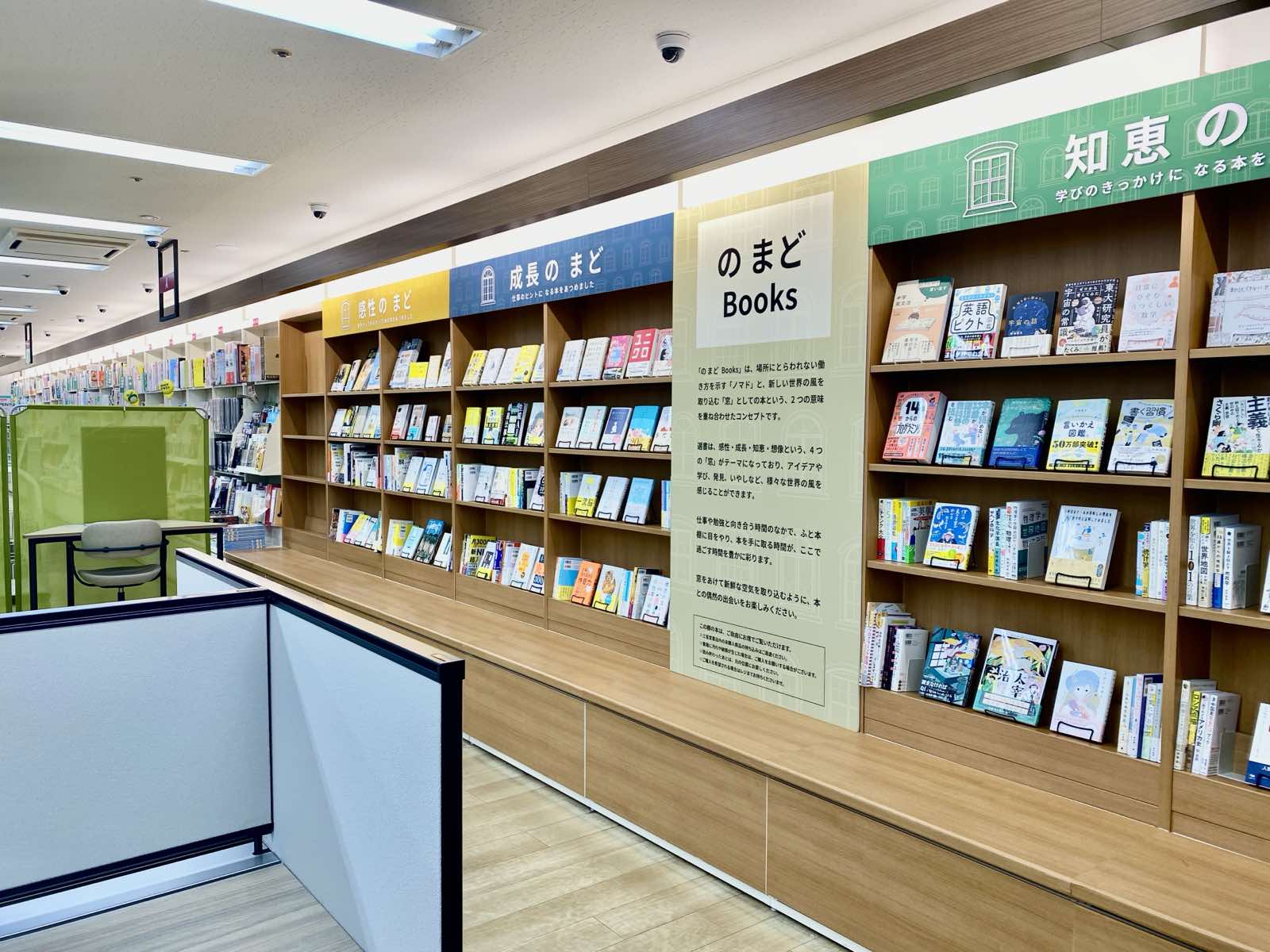 今回、スペース内には、日本出版販売株式会社が手掛けた、コンセプト本棚「の まどBooks」が設置されており、場所にとらわれない働き方を象徴する「ノマド」と、本を新しい世界へと繋がる「窓」に見立てた、2つの意味を掛け合わせたコンセプトです。